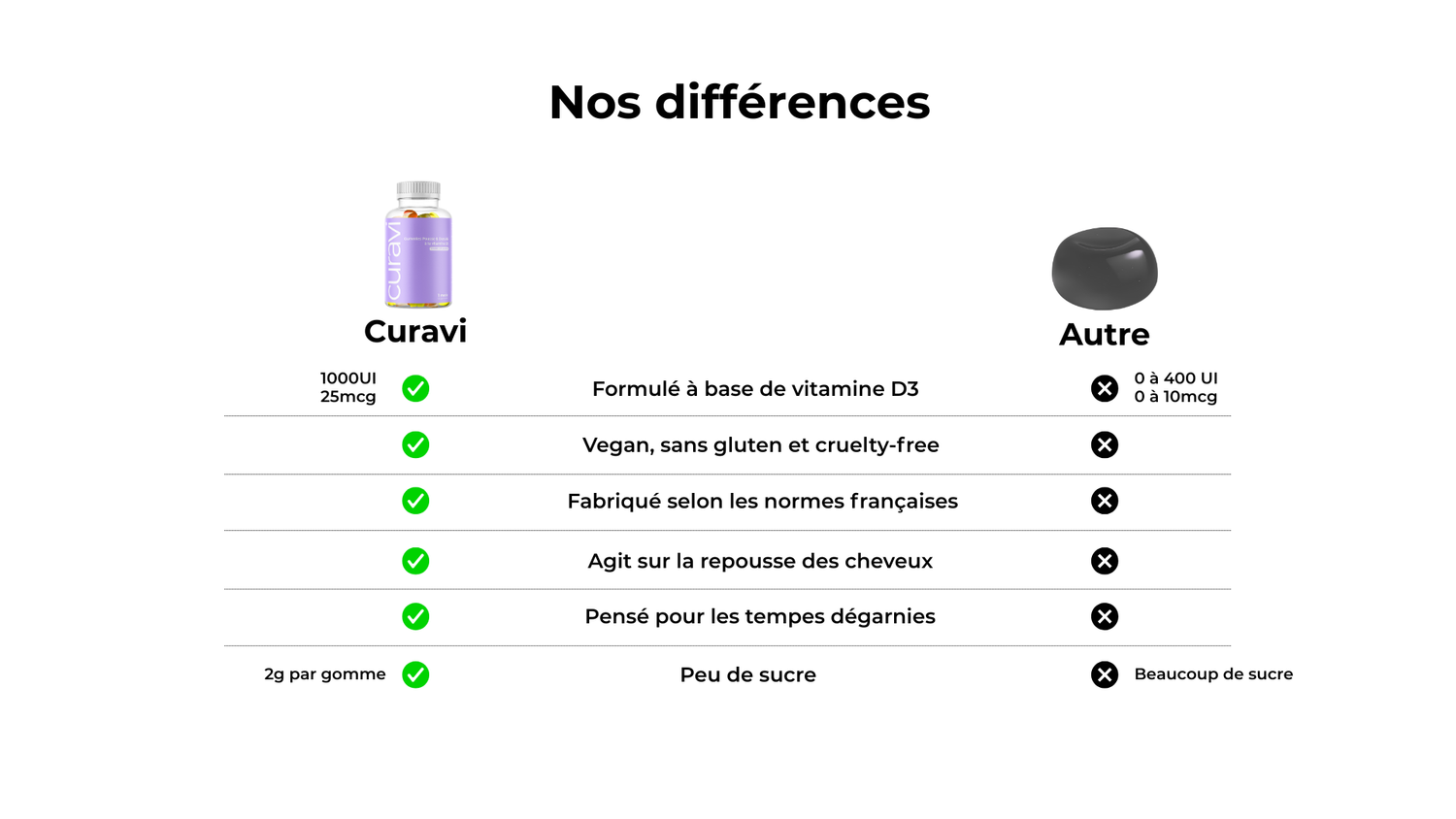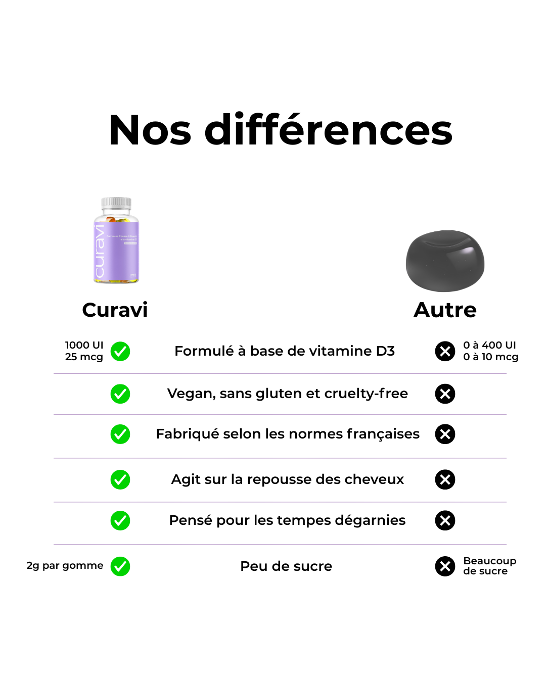 Curavi associe vitamine D3, zinc, biotine et vitamines du groupe B pour soutenir la croissance, renforcer la fibre capillaire et rééquilibrer le cuir chevelu.